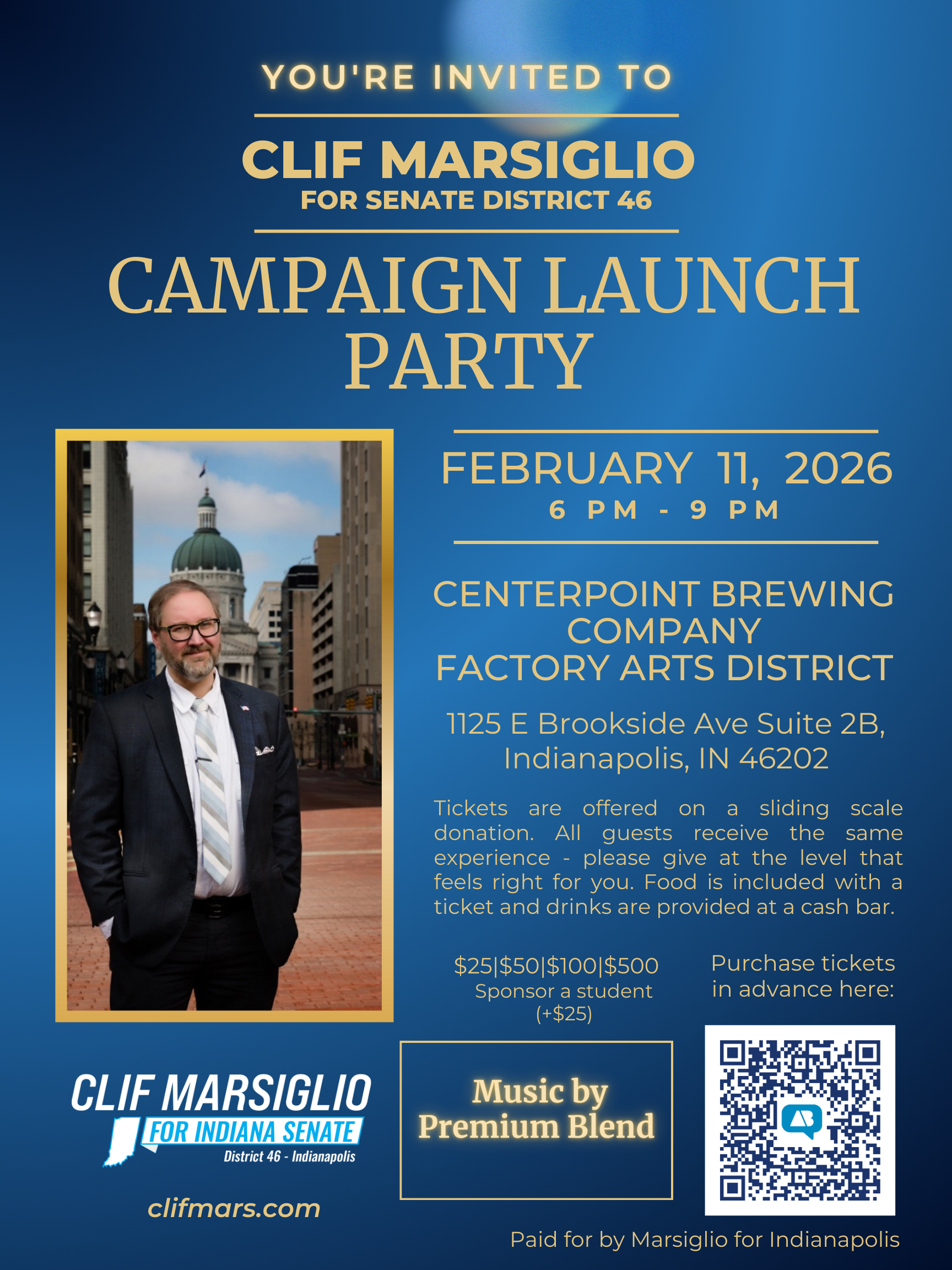 To kick off my campaign, I’m hosting a launch party at Centerpoint Brewing featuring the Indy local band “Premium Blend”. Tickets are offered on a sliding scale; every amount receives the same experience. Please give what you are able to.